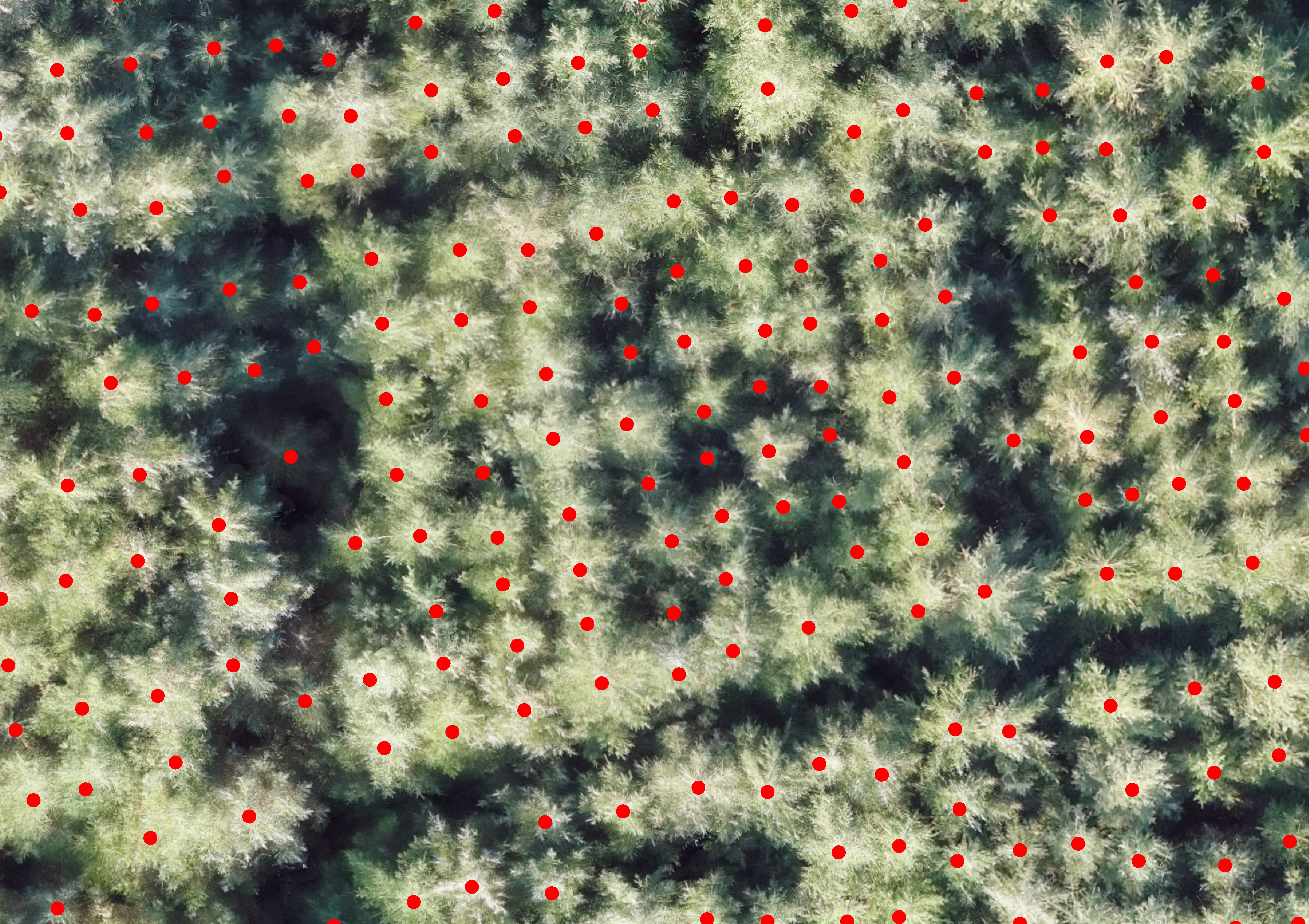 We ensure the highest level of accuracy by validating our results in the field. Ground control points (X) are placed throughout the survey area to improve absolute accuracy, while forest parameters such as DBH and height are recorded to help calibrate the image classification algorithms.