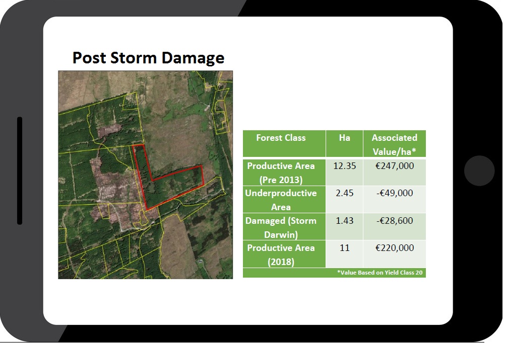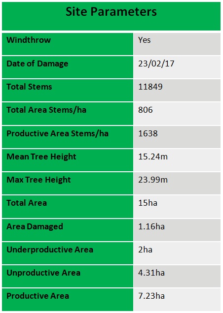 Parameters recorded from drone imagery surveys include, stems per hectare, height, productive area and wind damage.